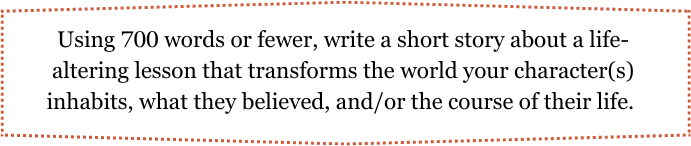What do we mean by ‘life-altering lesson'? You're free to interpret that as you wish. Your character(s) can be human or non-human. You are also free to write any type of story (even an autobiographical one). There are no restrictions or limitations on format, genre, or content.
